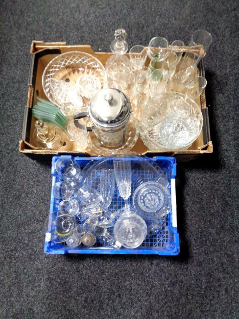 Two boxes containing assorted 20th century and later glassware to include decanter, drinking glasses, cut glass fruit bowl, Cafetiere etc.