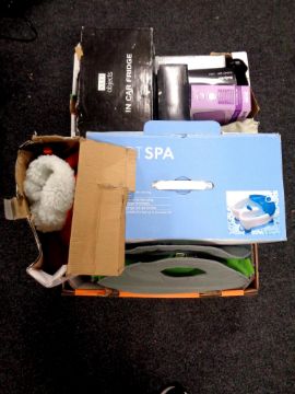 Two boxes of electricals - foot spa, car fridge, massager, power controlled socket sets