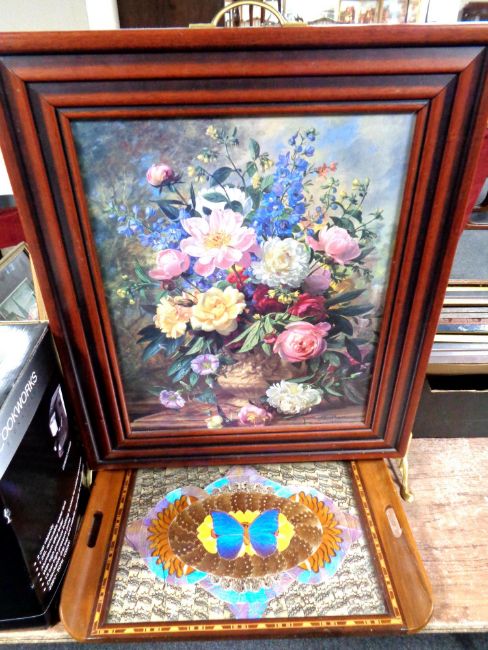 A contemporary fire screen with floral panel on brass feet, together with a Tourist butterfly tray.