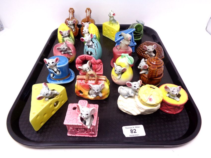 A box of foreign pottery ornaments and hand bells in the form of mice