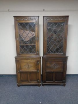 A pair of Jaycee oak leaded glass door corner cabinets, fitted cupboards beneath.