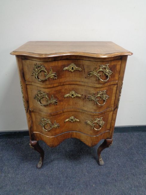 A 19th century serpentine fronted French walnut three drawer chest with ormolu mounts and handles on raised legs.