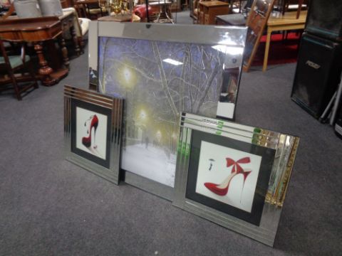 An all glass framed picture depicting a twilight street scene with glitter decoration together with two further contemporary mirrored framed prints of shoes.