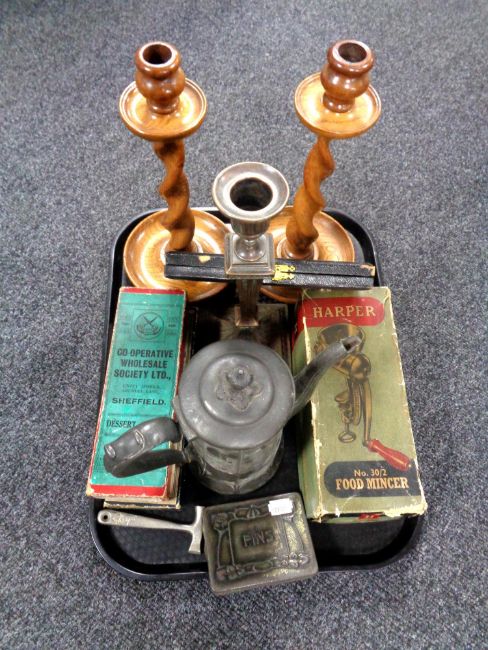 A tray containing antique and later miscellaneous to include pewter tea pot, brass candlestick, pair of Edwardian oak barley twist candlesticks, vintage Harper food mincer, boxed cutlery etc.