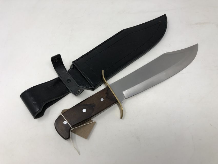 A modern bowie knife with wooden grip, blade length 25 cm, in black leather sheath.