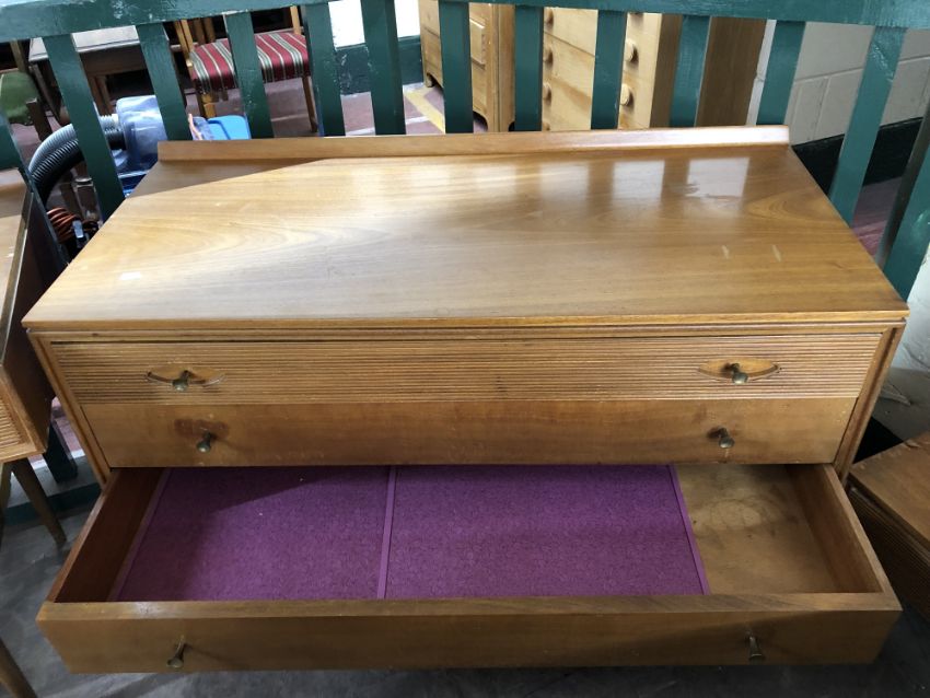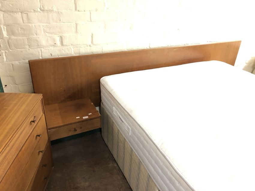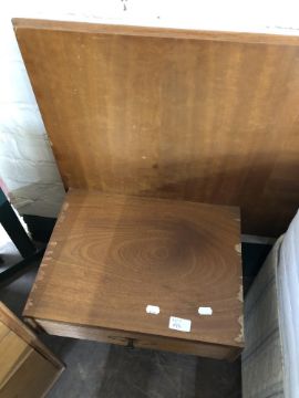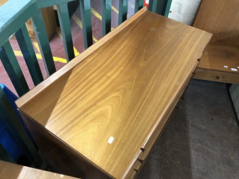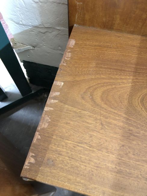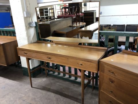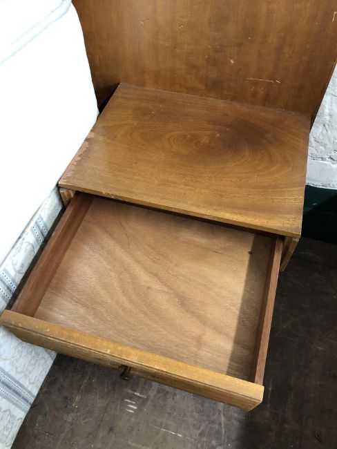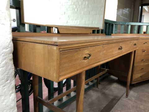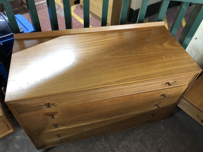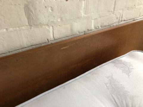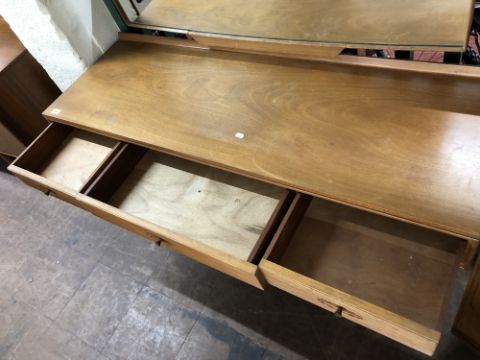 The dressing table has a little bit of wobble in the joints. There are some watermarks to the top and a small area of veneer loss. The chest of drawers also has some watermarks. The drawer second from the bottom has some damage along the edge of the drawer-front. The headboard has some noticeable areas of veneer damage to each side, as wall as scuffs and scratches to the finish. See images.