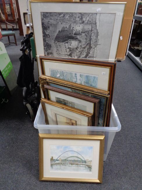 A box containing a large quantity of assorted pictures and prints to include Newcastle Millennium Bridge, a Newcastle topographical print in the reign of Queen Victoria etc.
