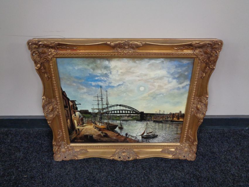 A gilt framed oil on board, boats in dock with bridge beyond, by J. E. Harker.