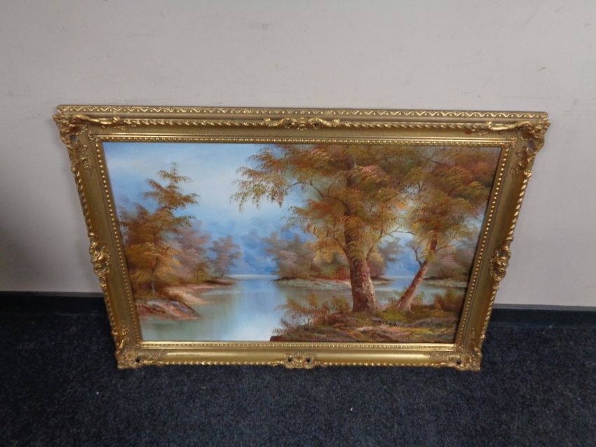 A gilt framed oil on canvas depicting a river through a wooded landscape.