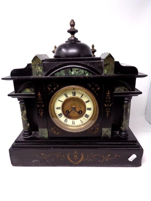 A 19th century black slate and marble mantel clock with a brass and enamel dial.