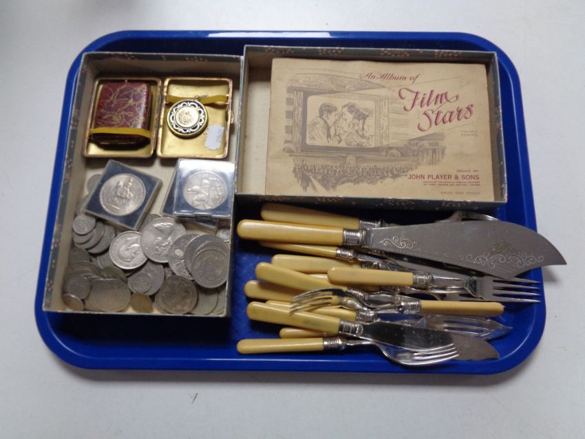A tray of Player's and Wills cigarette cards in albums of film stars, plated fish cutlery, assorted pre decimal coins, crowns, cigarette case etc