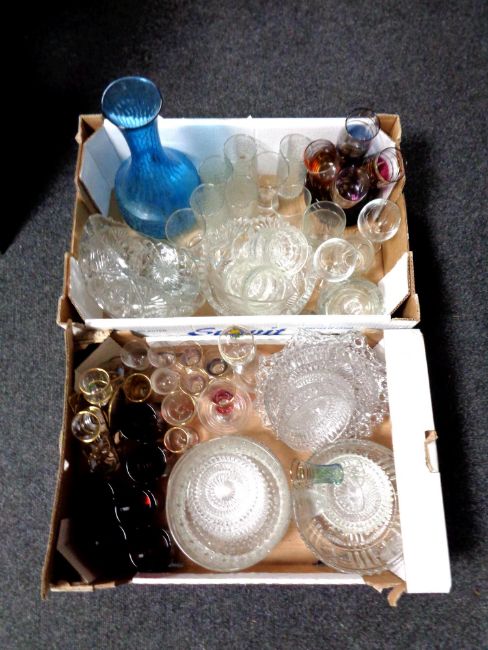 Two boxes of a quantity of 20th century glass ware to include pressed glass bowls, drinking glasses, 1970's blue glass vase etc