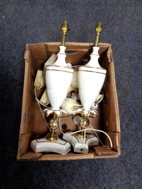 A box containing a pair of brass and ceramic table lamps together with five further alabaster table lamps.