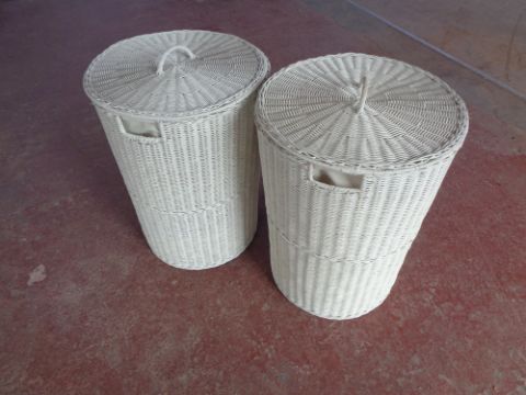 A painted blanket box together with two wicker linen baskets