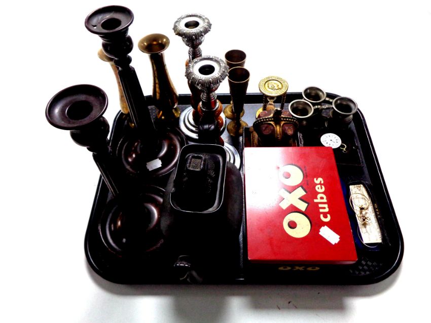 A tray of teapot, vintage Oxo tin, candlesticks, brass ware, coronation money box etc