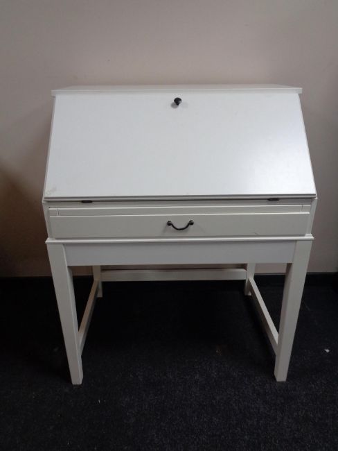 An Ikea writing bureau, fitted a drawer, on raised legs.