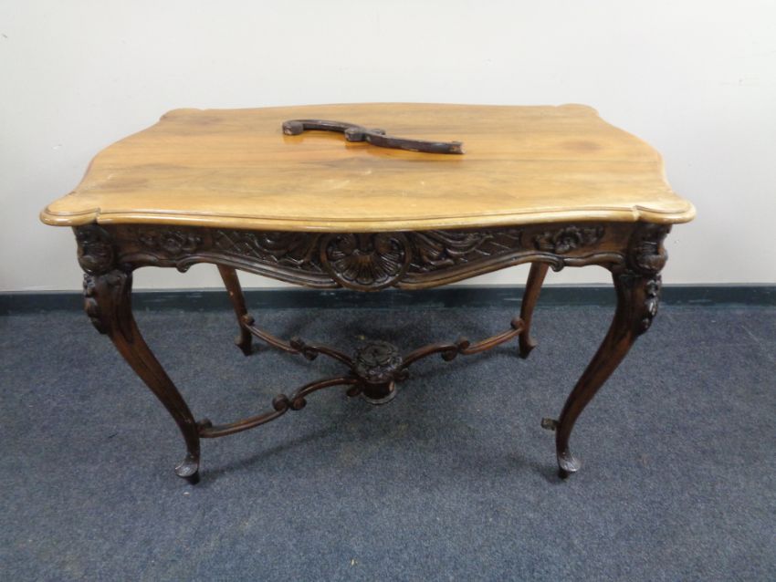 An early 20th century shaped walnut drawing room table on carved cabriole legs (under stretcher a/f).