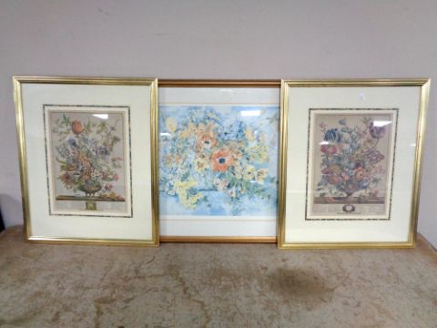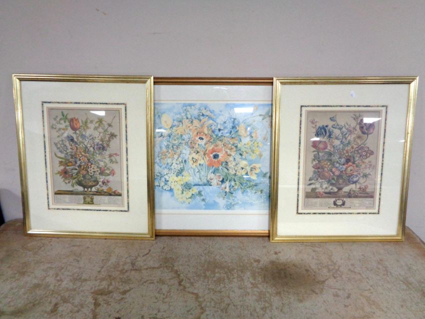 A gilt framed Gillian French signed print of flowers in a vase and two further gilt framed engravings by Fletcher, titled April and February
