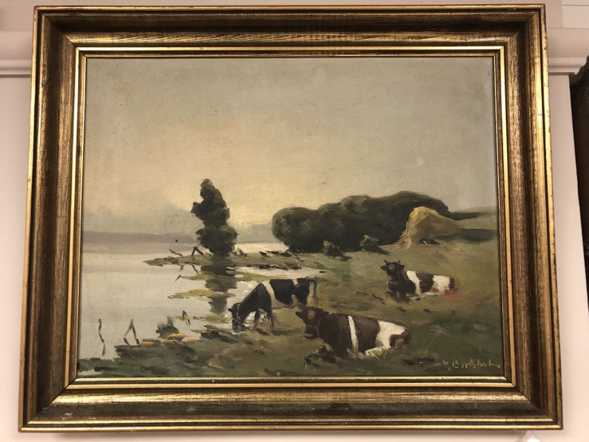 Continental school : Cattle watering, oil on canvas, 39 x 30 cm, indistinctly signed, framed.