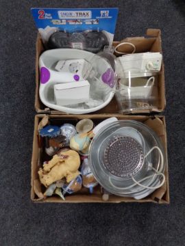 Two boxes of oriental style teapots, ornaments, kitchen electricals, foot spa etc