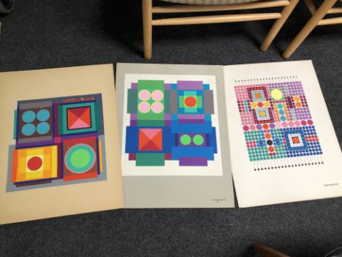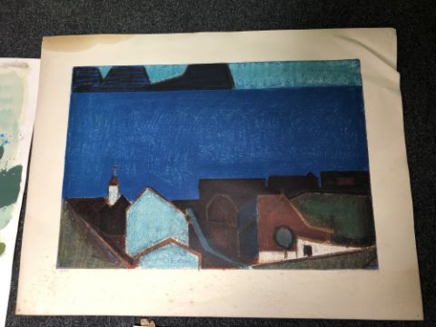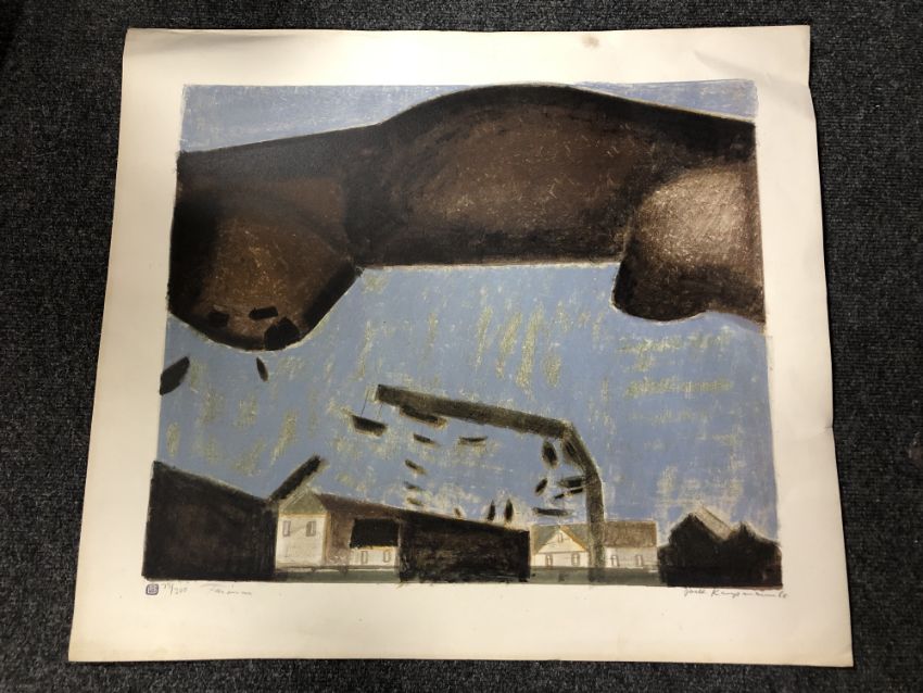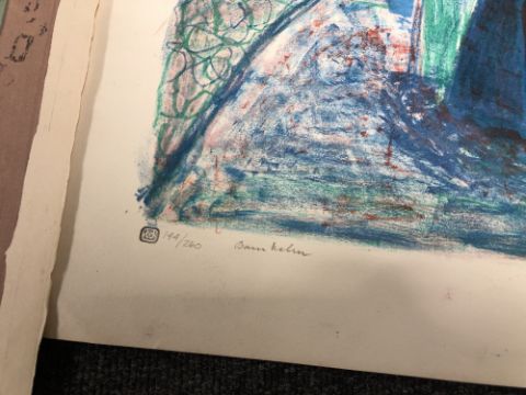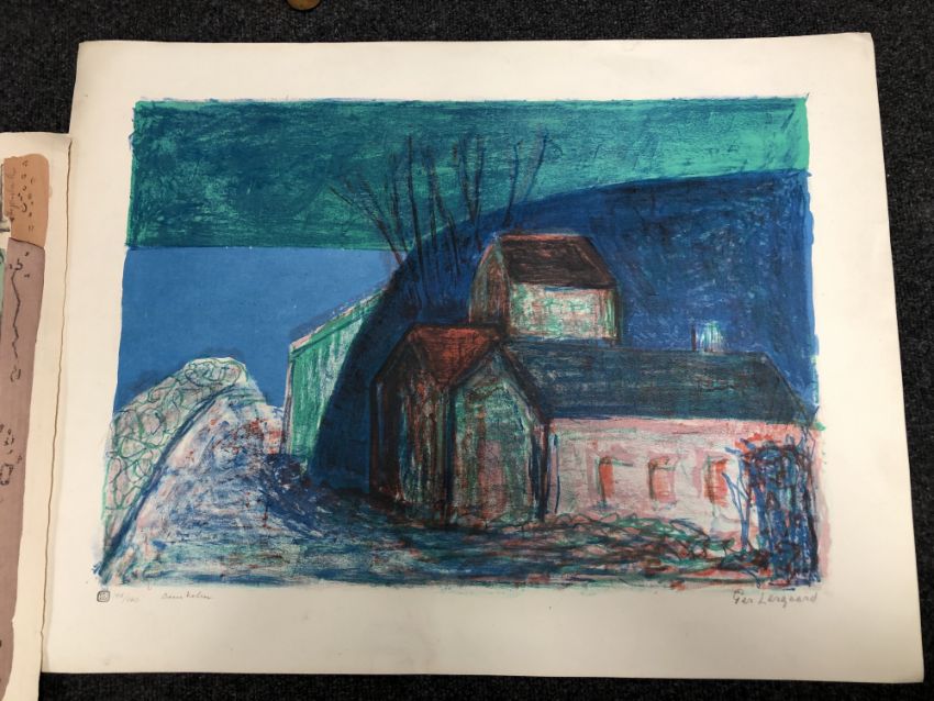 A group of six continental chromo lithographic prints, indistinctly signed, together with three collage pictures signed H. Frost Nielsen and one further chromo lithograph picture. (All unframed, in a folio)