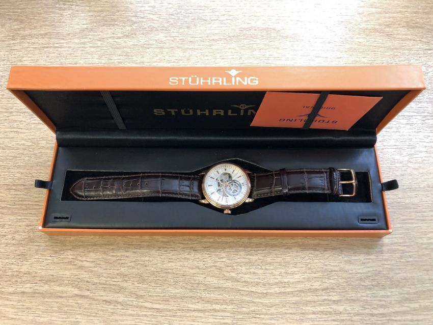 A gent's stainless steel Stuhrling automatic wristwatch with visible movement, boxed.