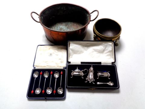 A tray containing antique copper brass handled pan, a copper planter on raised feet, cased plated tea spoons and cruet set.