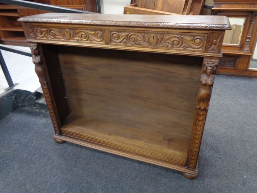 A set of early 20th century profusely carved oak open bookshelves, fitted two drawers above.