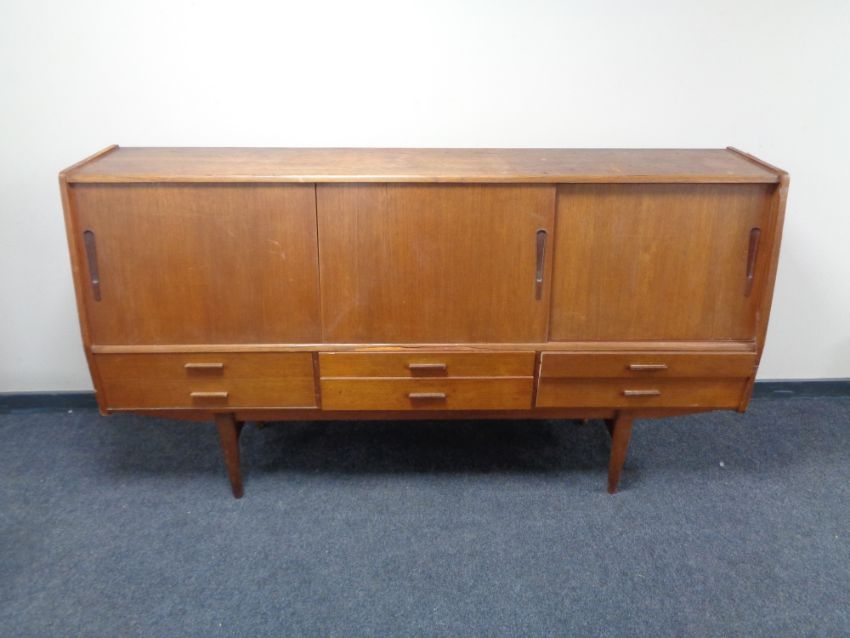 A mid 20th century teak sliding door sideboard, fitted six drawers beneath, on raised legs.