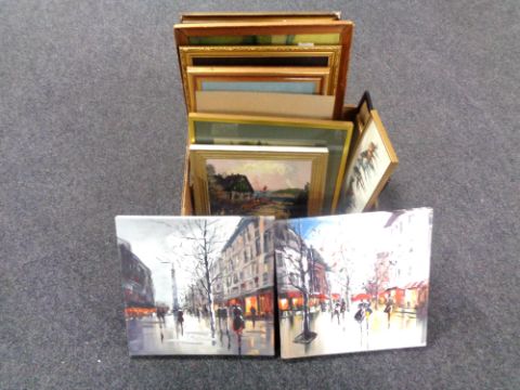 A box of assorted pictures - oils on canvas, framed still life, watercolour St Mary's Island etc