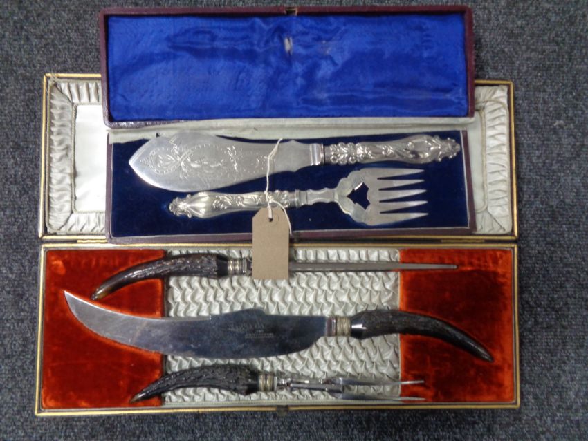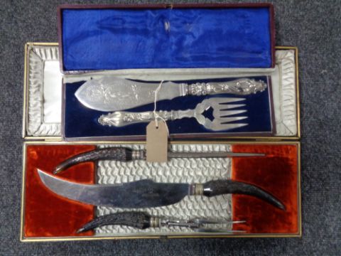 A Victorian silver plated two part fish server in case together with a further horn handled carving set in case. (2)