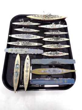 A tray containing 16 die cast battleships on stands.