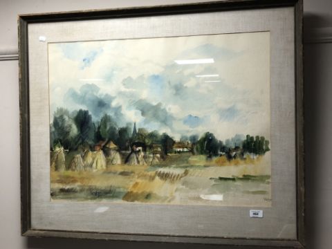 A 20th century watercolour, Field with village beyond, signed Phillips.