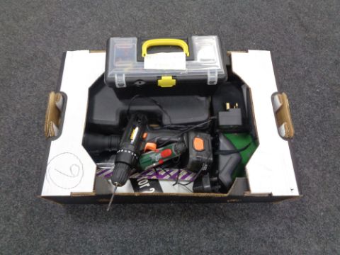 A box containing cased Xtreme 250W multi tool, electric hand drills by Bosch, Challenge hand torch, small toolbox of hand tools etc.