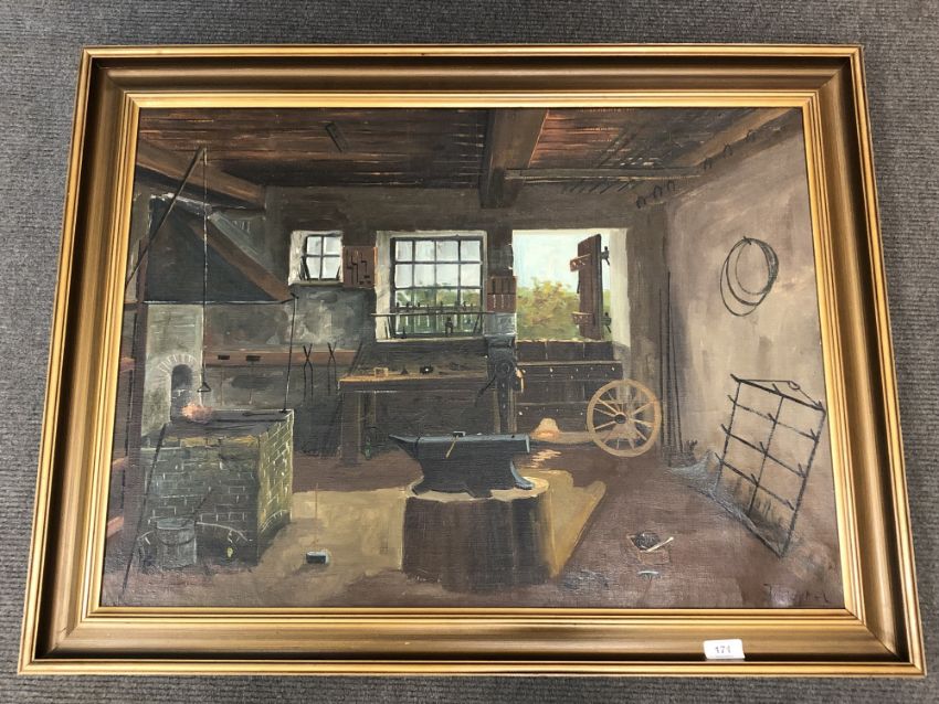 Joli Gytel : The interior of a blacksmith's shop, oil on canvas, signed, 54 x 75 cm, framed.