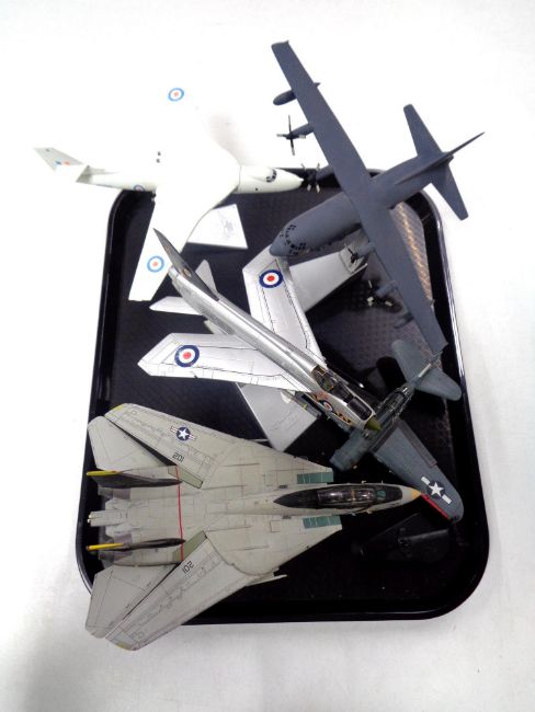 A tray containing three Corgi Aviation Archive die cast model aircraft on stands, together with two further similar model aircraft.