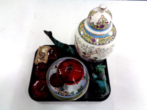 A tray containing 20th century oriental lidded vase on stand, weighed tortoises, collector's plates, red glassware including pair of dwarf candlesticks, lidded bon bon dish etc.
