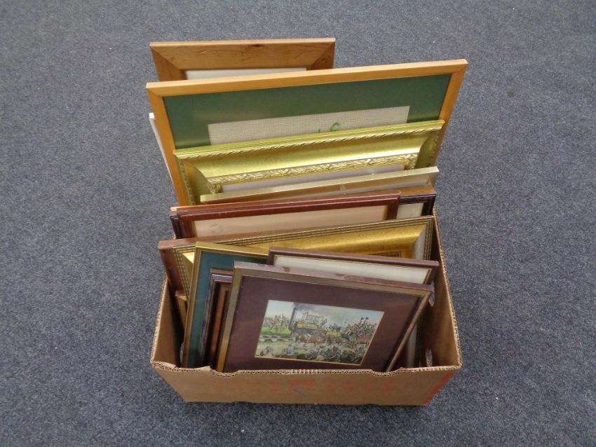 Two boxes containing 20th century pictures and prints, framed nautical knot montage etc.