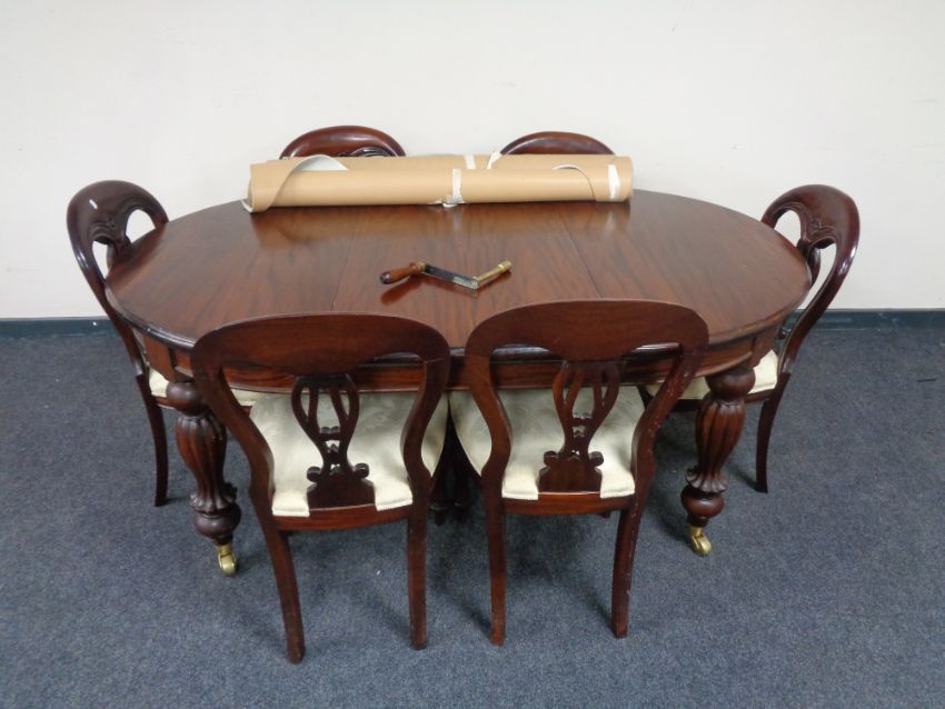 A reproduction mahogany extending dining table with leaf and winder together with a set of six carved balloon back dining chairs
