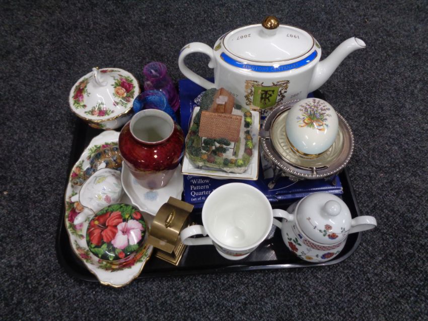 A tray containing Royal Albert Old Country Roses china, Ringtons tea pot, mantel clock, Wilton ware oriental lustre vase etc.