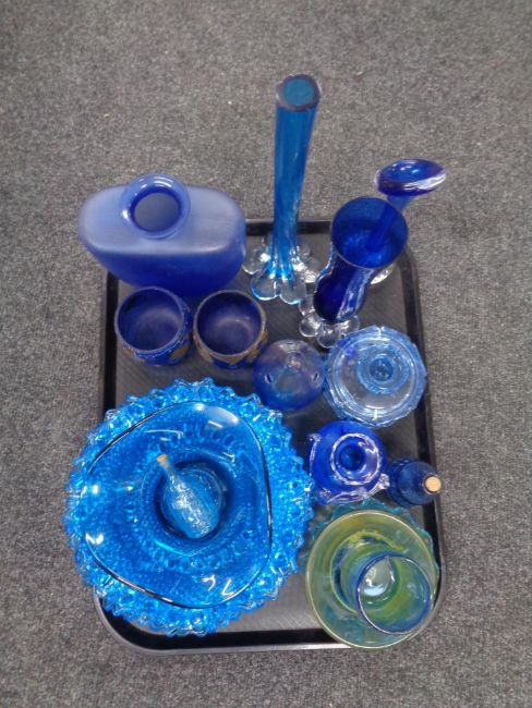 A tray containing a quantity of blue glassware including vases, lidded ashtray etc