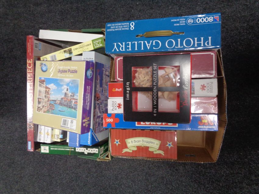 Two boxes containing contemporary jigsaws and puzzles, some sealed in retail packaging.