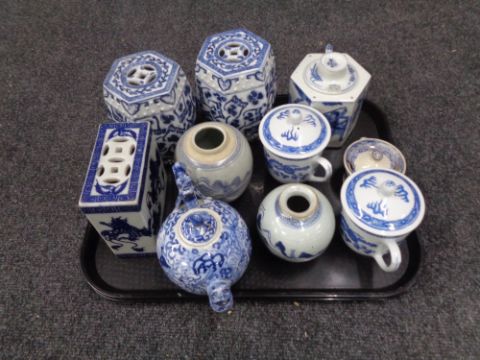 A tray of 20th century blue and white porcelain including a pair of hexagonal barrel vases, teapots, Balister vase etc.