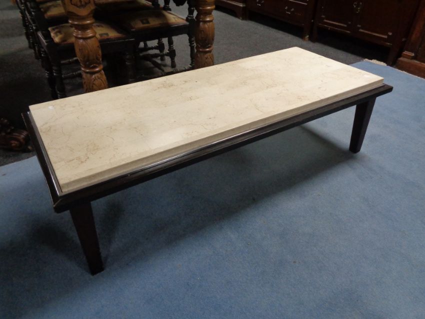 A contemporary rectangular coffee table with inset marble top