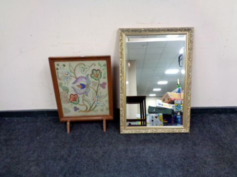 A contemporary gilt framed bevel edged over mantel mirror together with an embroidered fire screen.