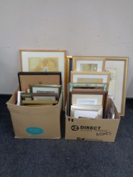 Two boxes containing 20th century pictures and prints, contemporary wall clock
