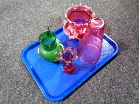 A tray containing four pieces of antique glassware to include a hand painted green glass jug, a cranberry glass bowl on raised feet together with two cranberry glass vases.