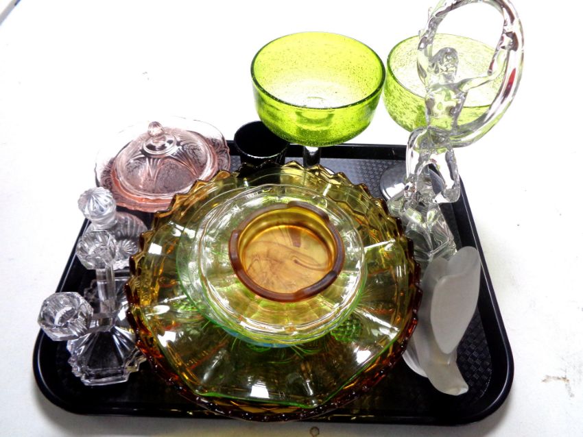 A tray containing antique and later glassware to include Davidson's glass, amber and green glass bowls, figure of Art Deco dancer