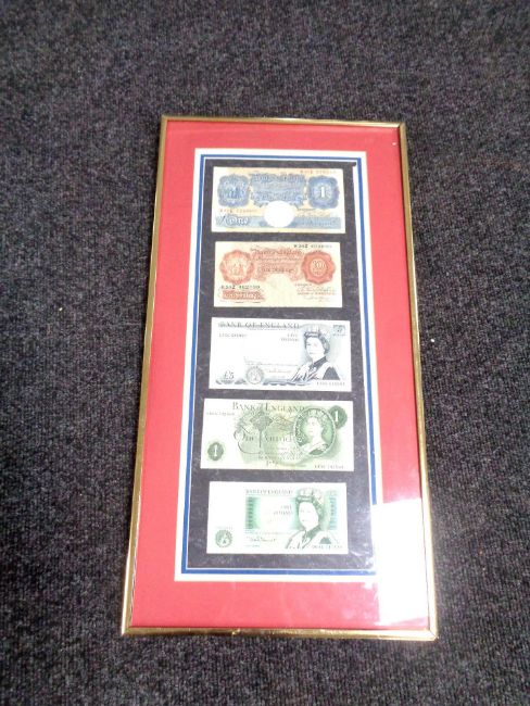 A frame containing five English bank notes