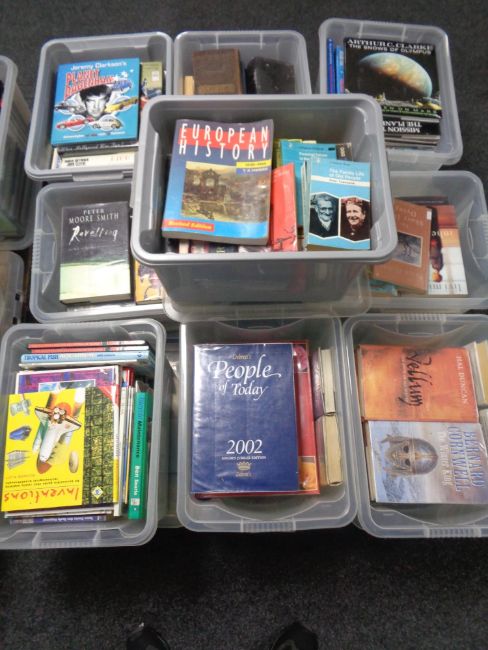 A pallet containing nine plastic storage crates containing books, various